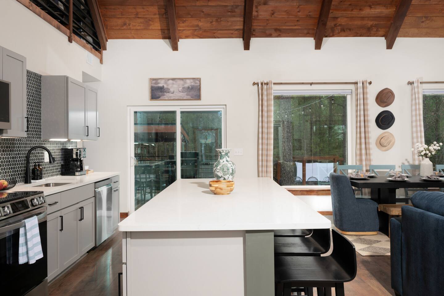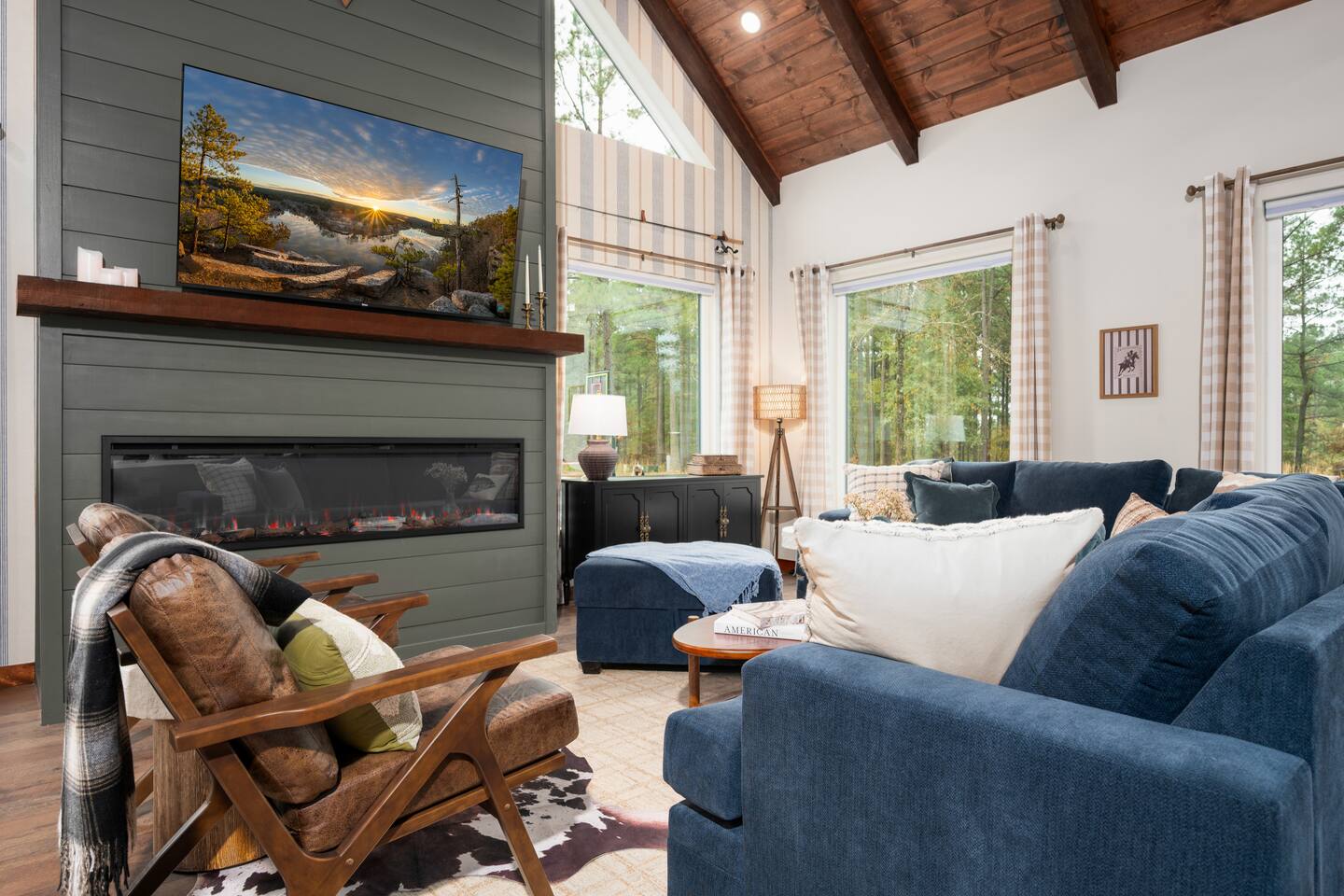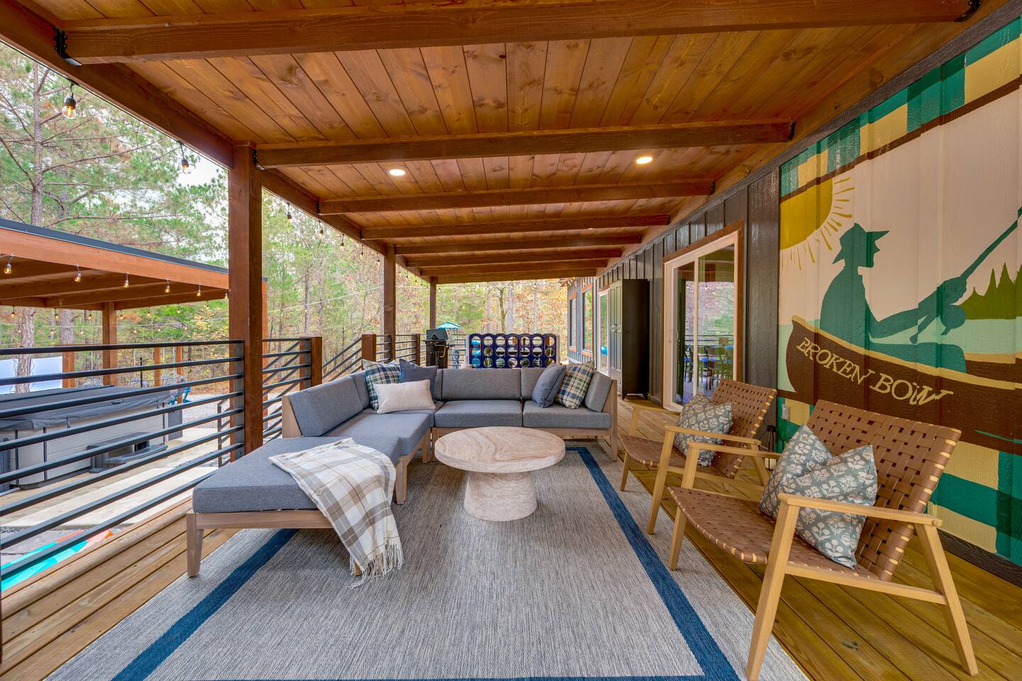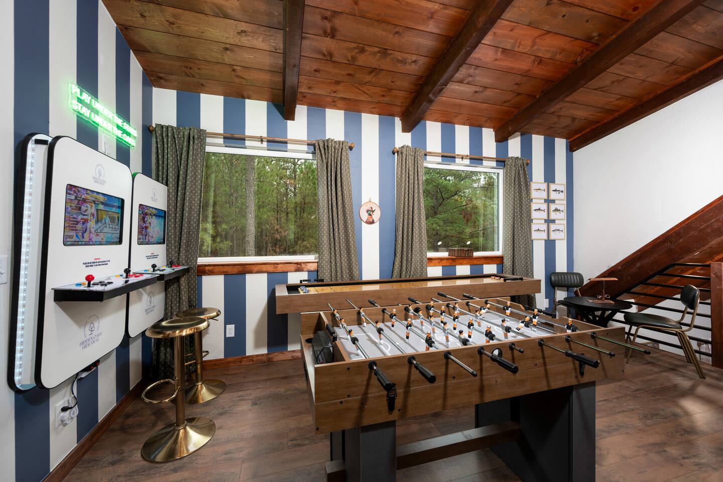 ✨ Hidden Oaks Hideaway - Where Luxury Meets Nonstop Fun in the Broken Bow Woods ✨ Welcome to Hidden Oaks Hideaway, a spacious 2,000 sq ft retreat tucked away on 1.5 acres of peaceful forest - perfect for families, friends, and group getaways. This modern cabin sleeps up to 15 guests with 4 bedrooms and 3 bathrooms, all designed for comfort, connection, and unforgettable fun. Step inside to soaring vaulted ceilings, large windows with serene forest views, and an open living area ideal for gathering. Cozy up by the stone fireplace or enjoy movie nights on the 65" Smart TV. The fully stocked kitchen includes: ☕ Keurig Coffee Maker 👩🏻🍳 Crock Pot, Blender, Mixer, Griddle, Toaster 🍴Plenty of Cookware, Utensils & Serveware Enjoy meals together with seating for 10 at the dining table plus 5 at the island - perfect for celebrations, holidays, and family feasts. 🌲 Outdoor Oasis Your private outdoor playground includes: 🏓 THE ORIGINAL Glow Pickleball / Basketball Court 🎬 Outdoor Movie Theater w/ Projector & Screen 🔥 Cozy Fire Pit Lounge ♨️ Cedar Sauna + Hot Tub on Lower Deck 🍔 Patio with Grill, Outdoor Dining Table 🍻 Covered Lounge Area w/ Outdoor Fireplace 🎨 Custom Broken Bow Mural 🛝 Kids’ Playground 🛶 Paddleboards, Kayaks & Life Jackets 🅿️ Parking for 6 vehicles + Trailer/Boat Space ⚡ EV Charger 🛏️ Bedrooms & Bathrooms - 1 King Suite w/ Sleeper Sofa & Ensuite Bath - 1 Queen Bedroom w/ Main Level Bathroom - 1 Double Queen Bedroom - 1 Bunk Room with 2 Full and 1 Twin Trundle Bed - Shared Upstairs Bathroom 🎮 Fun for Everyone! The upstairs loft game room is an entertainment paradise: 🥌 Shuffleboard 🥅 3-in-1 game table (foosball, air hockey, ping pong) 👾 2 arcade machines w/ 1,000+ classic games ♟️ Board games for all ages 🐾 Additional Amenities - Pet-friendly (fee applies) - High-speed WiFi - Pack ’n Play + highchair provided 📍 Location You’ll be close to everything Broken Bow has to offer: - 7 min – Hochatown dining & breweries - 8 min – Choctaw Landing Casino - 16 min – Broken Bow - 17 min – Beavers Bend State Park - 19 min – Broken Bow Lake 🌟 Perfect for Relaxation, Adventure & Memory-Making Whether you're soaking in the hot tub under twinkle lights, challenging friends to pickleball, or watching a movie under the stars, Hidden Oaks Hideaway is designed for connection, comfort, and unforgettable experiences. We’re committed to making your stay exceptional. If you need anything during your visit, we’re just a message away. 🌿 Before Booking Our cabin is nestled deep in beautiful Broken Bow forest. While we schedule regular professional pest control, sightings of insects or critters are still possible in wooded areas. Please keep doors closed and store food properly.