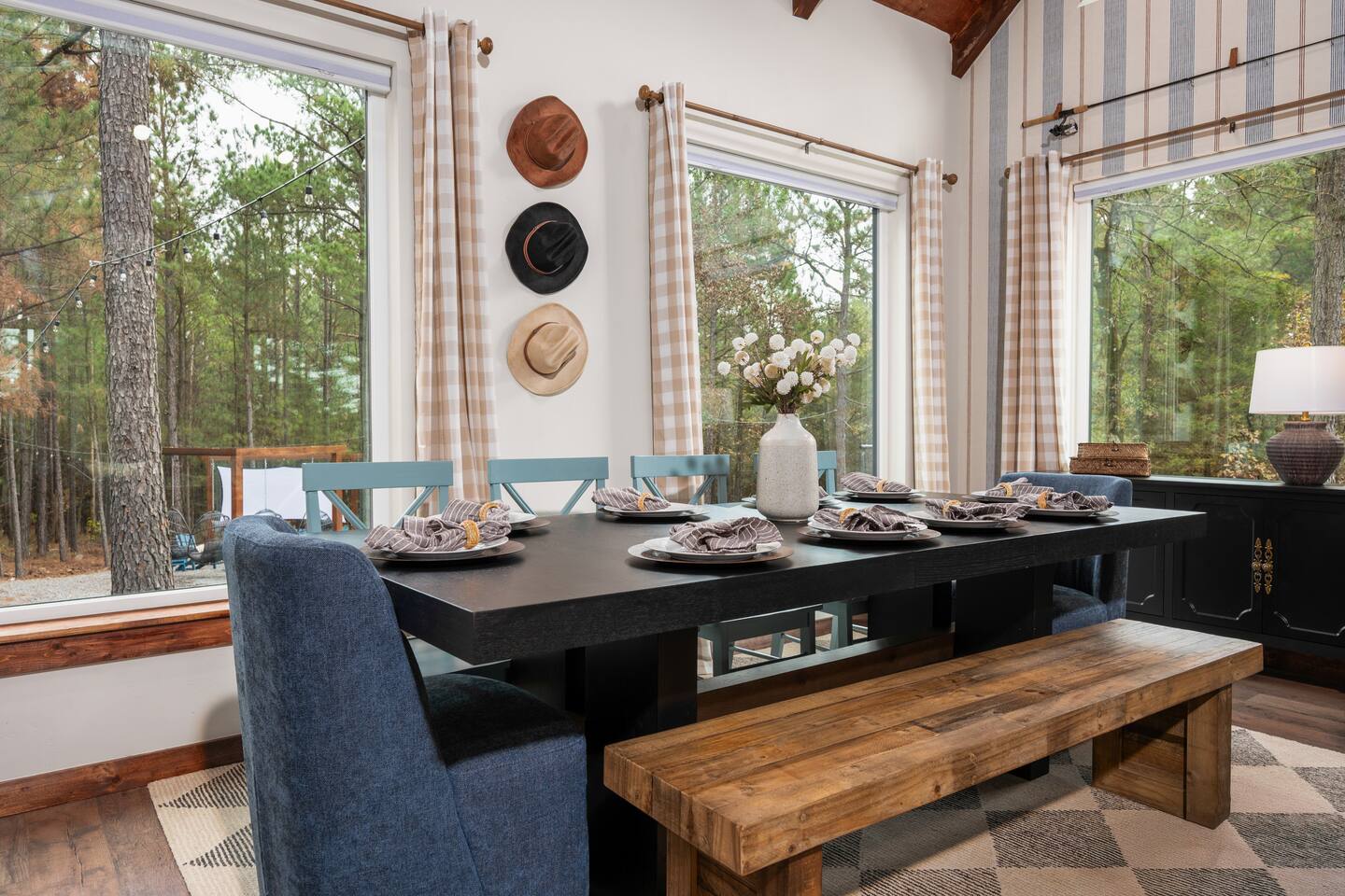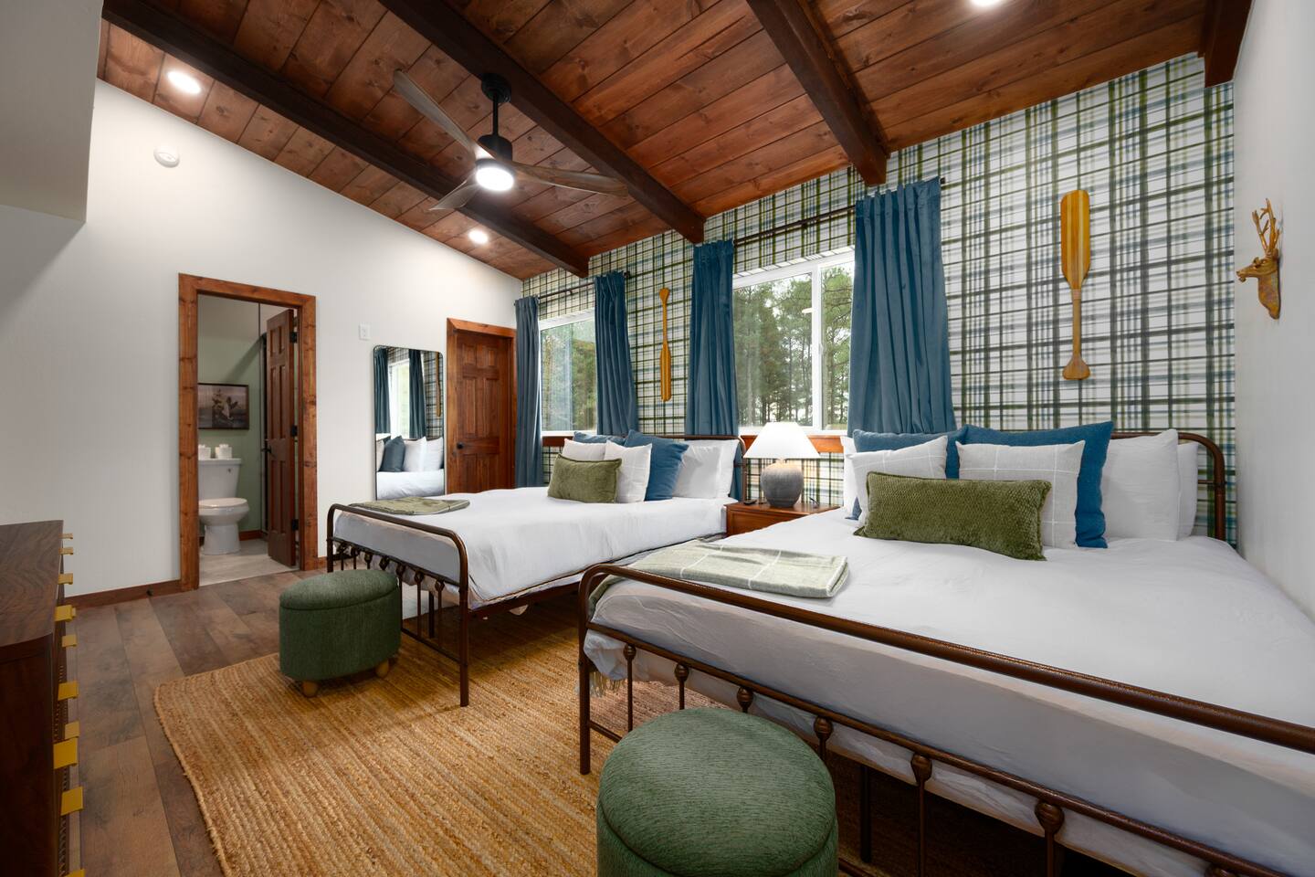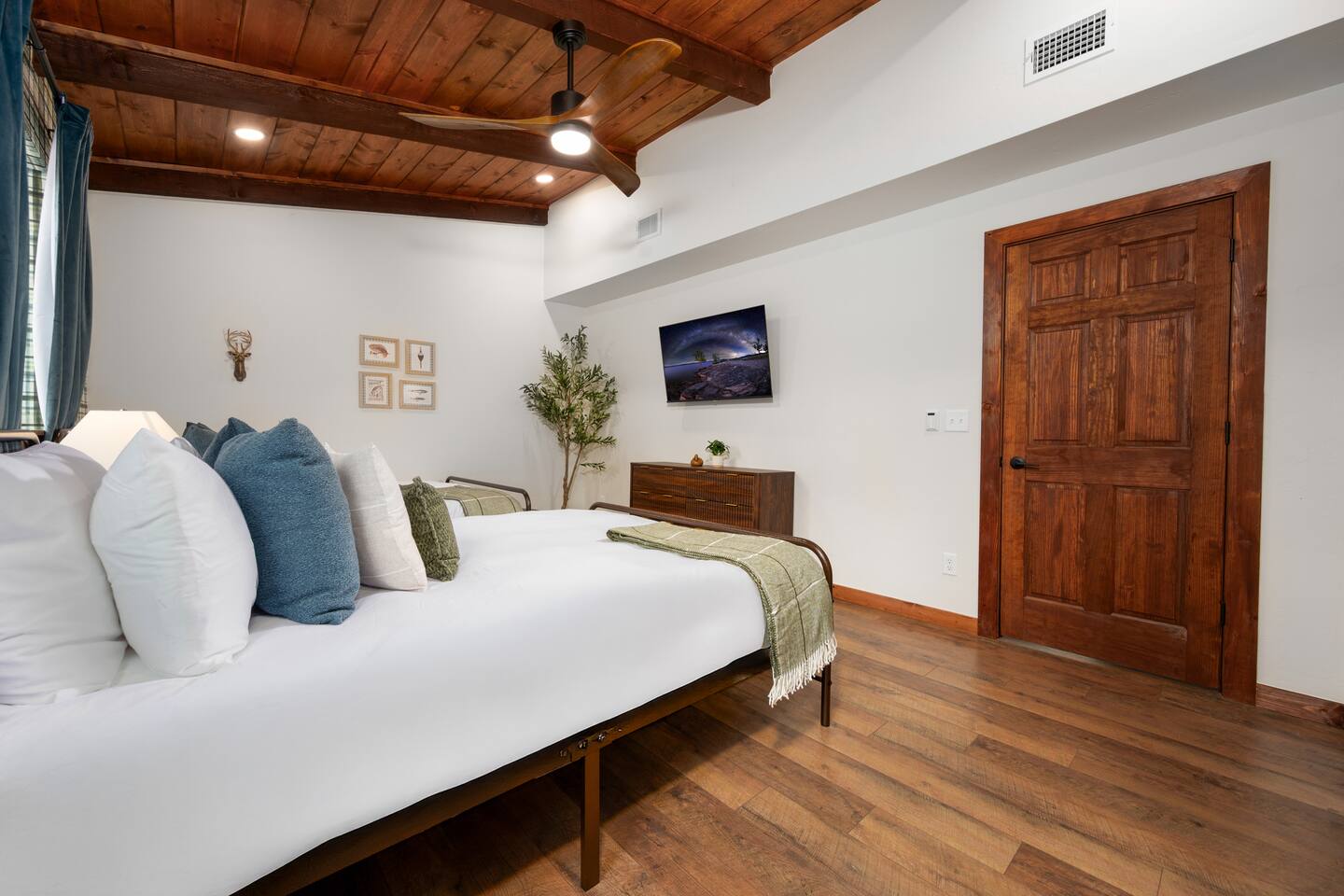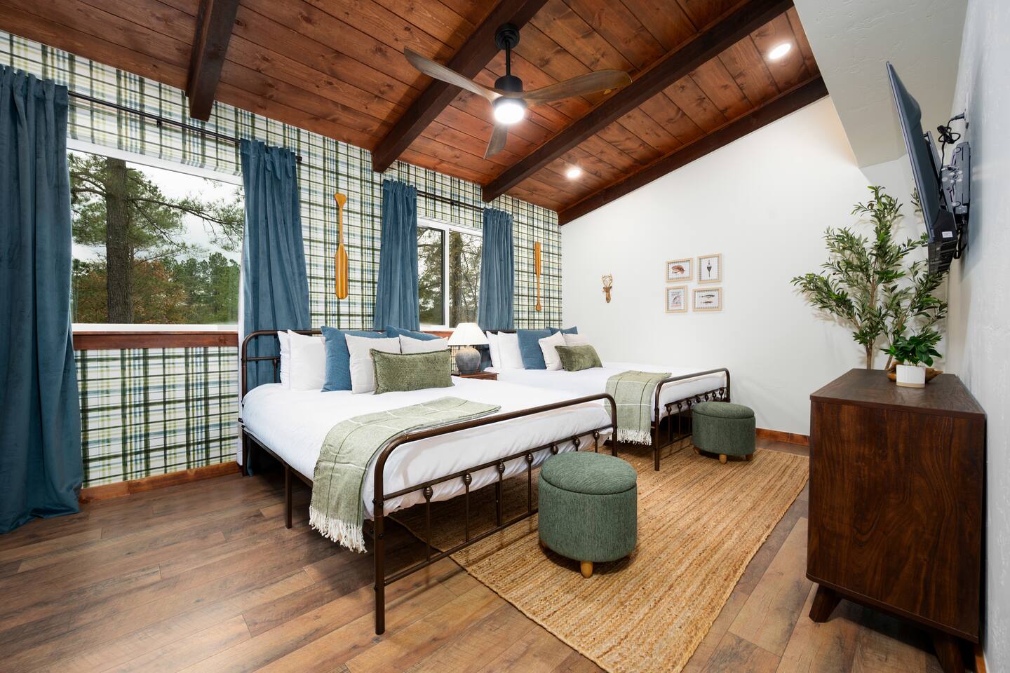 ✨ Hidden Oaks Hideaway - Where Luxury Meets Nonstop Fun in the Broken Bow Woods ✨ Welcome to Hidden Oaks Hideaway, a spacious 2,000 sq ft retreat tucked away on 1.5 acres of peaceful forest - perfect for families, friends, and group getaways. This modern cabin sleeps up to 15 guests with 4 bedrooms and 3 bathrooms, all designed for comfort, connection, and unforgettable fun. Step inside to soaring vaulted ceilings, large windows with serene forest views, and an open living area ideal for gathering. Cozy up by the stone fireplace or enjoy movie nights on the 65" Smart TV. The fully stocked kitchen includes: ☕ Keurig Coffee Maker 👩🏻🍳 Crock Pot, Blender, Mixer, Griddle, Toaster 🍴Plenty of Cookware, Utensils & Serveware Enjoy meals together with seating for 10 at the dining table plus 5 at the island - perfect for celebrations, holidays, and family feasts. 🌲 Outdoor Oasis Your private outdoor playground includes: 🏓 THE ORIGINAL Glow Pickleball / Basketball Court 🎬 Outdoor Movie Theater w/ Projector & Screen 🔥 Cozy Fire Pit Lounge ♨️ Cedar Sauna + Hot Tub on Lower Deck 🍔 Patio with Grill, Outdoor Dining Table 🍻 Covered Lounge Area w/ Outdoor Fireplace 🎨 Custom Broken Bow Mural 🛝 Kids’ Playground 🛶 Paddleboards, Kayaks & Life Jackets 🅿️ Parking for 6 vehicles + Trailer/Boat Space ⚡ EV Charger 🛏️ Bedrooms & Bathrooms - 1 King Suite w/ Sleeper Sofa & Ensuite Bath - 1 Queen Bedroom w/ Main Level Bathroom - 1 Double Queen Bedroom - 1 Bunk Room with 2 Full and 1 Twin Trundle Bed - Shared Upstairs Bathroom 🎮 Fun for Everyone! The upstairs loft game room is an entertainment paradise: 🥌 Shuffleboard 🥅 3-in-1 game table (foosball, air hockey, ping pong) 👾 2 arcade machines w/ 1,000+ classic games ♟️ Board games for all ages 🐾 Additional Amenities - Pet-friendly (fee applies) - High-speed WiFi - Pack ’n Play + highchair provided 📍 Location You’ll be close to everything Broken Bow has to offer: - 7 min – Hochatown dining & breweries - 8 min – Choctaw Landing Casino - 16 min – Broken Bow - 17 min – Beavers Bend State Park - 19 min – Broken Bow Lake 🌟 Perfect for Relaxation, Adventure & Memory-Making Whether you're soaking in the hot tub under twinkle lights, challenging friends to pickleball, or watching a movie under the stars, Hidden Oaks Hideaway is designed for connection, comfort, and unforgettable experiences. We’re committed to making your stay exceptional. If you need anything during your visit, we’re just a message away. 🌿 Before Booking Our cabin is nestled deep in beautiful Broken Bow forest. While we schedule regular professional pest control, sightings of insects or critters are still possible in wooded areas. Please keep doors closed and store food properly.